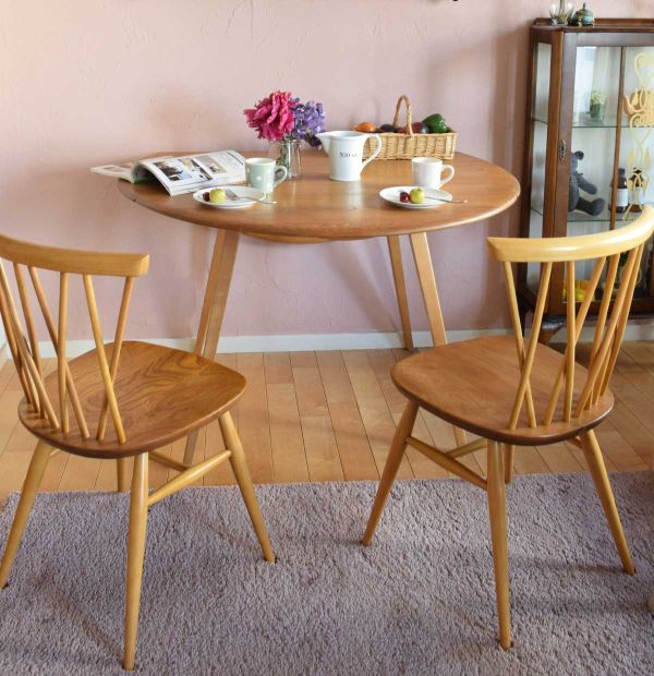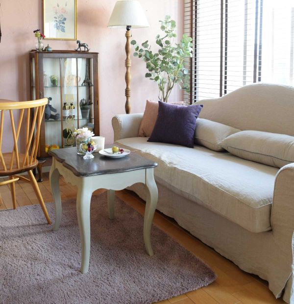 帰ってきてから友達と遊びに行ってばかりいる末っ子は、夜になって大慌てで宿題をする生活(笑)なので、アーコールのドロップリーフテーブルをカウンターのように使って、リビングで宿題をするコーナーを作ってみました。 片方のリーフを閉じて、壁にピタっと付けて出来た即席のカウンターに、お揃いのエックスバックチェアを2つ並べて、2人並んで宿題&読書Time! マリーに2色のクッションを並べて、ほんのり春色リビングにしていました。ポイントはパープル!これがあるだけで、一気に桜色が際立ってきます。