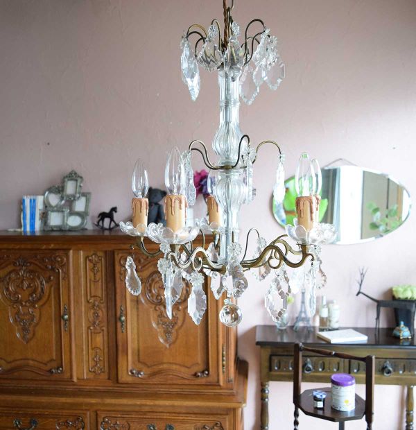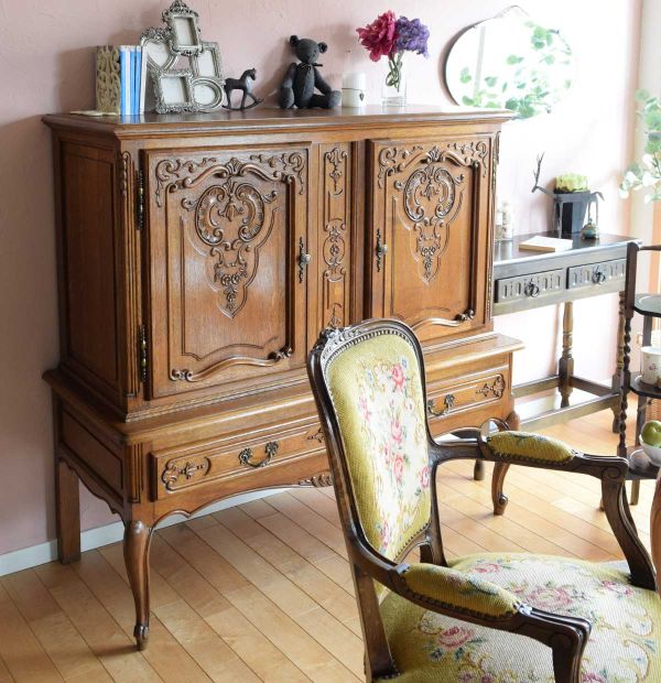 彫が立派なアンティークのサイドボードをお部屋の壁にドーンと置いただけで存在感がスゴイ~!負けないように、これまた彫がスゴイ、コーヒーテーブルを置いて、キラッキラのシャンデリアを吊るしてみました。