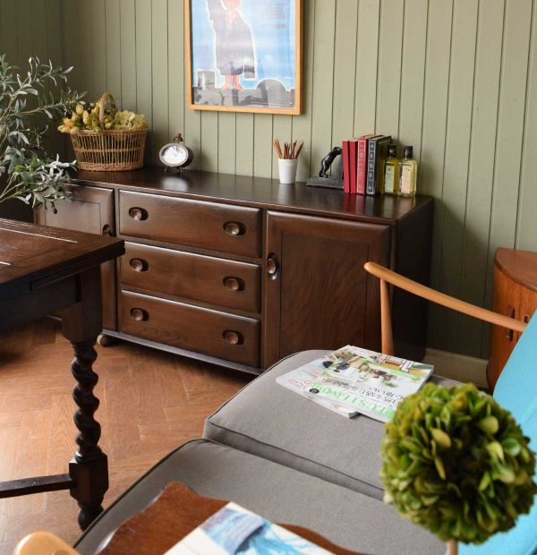 大きなワードローブを食器棚に使う、英国スタイルのダイニング