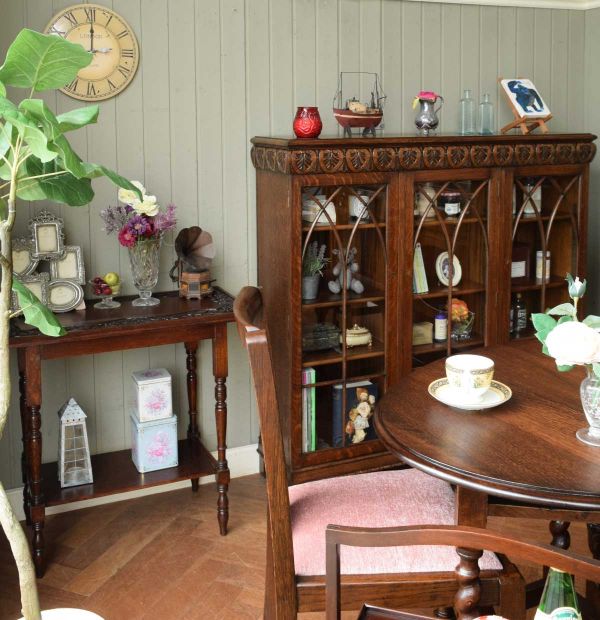 大きなワードローブを食器棚に使う、英国スタイルのダイニング