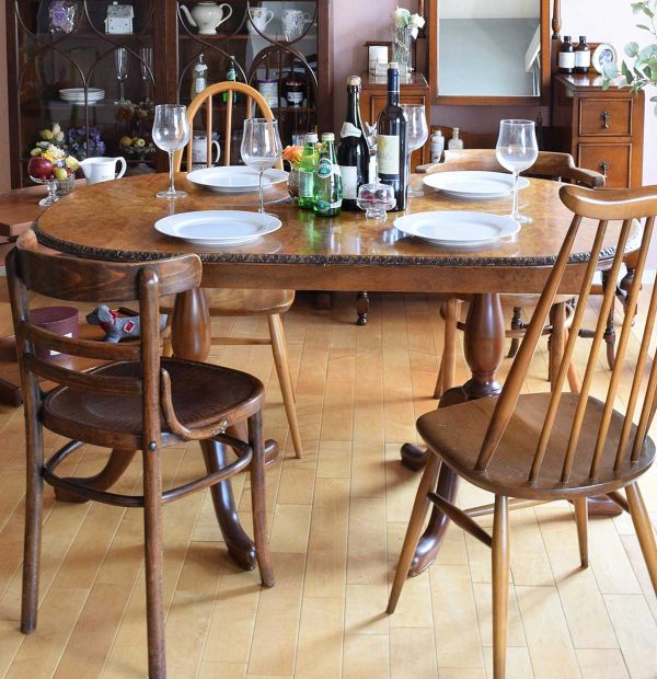 大きなワードローブを食器棚に使う、英国スタイルのダイニング