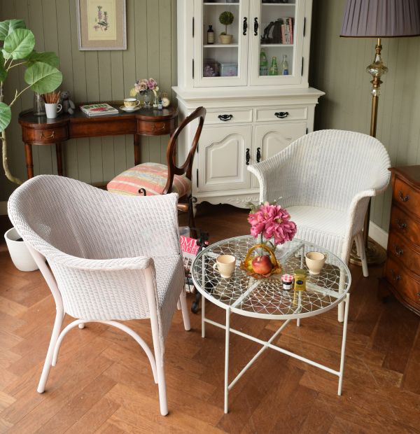 倉庫の中を見ていたら、同じような形のロイドルームチェアを発見したので、2脚を中心に、白と茶色を半分ずつ組み合わせたリビングをコーディネートしてみました。 椅子の真ん中にコントワールドファミーユのテーブルを置いて上からのぞいてみると、めっちゃくちゃ可愛い~!ロイドルームは2脚とも白だけど、白のトーンが違っていて、それぞれが個性的。 マホガニー材のデスクとミニチェストの色が白い空間をキュッと引き締めるので、全部を白でコーディネートするより私はこっちの方が好きだな~