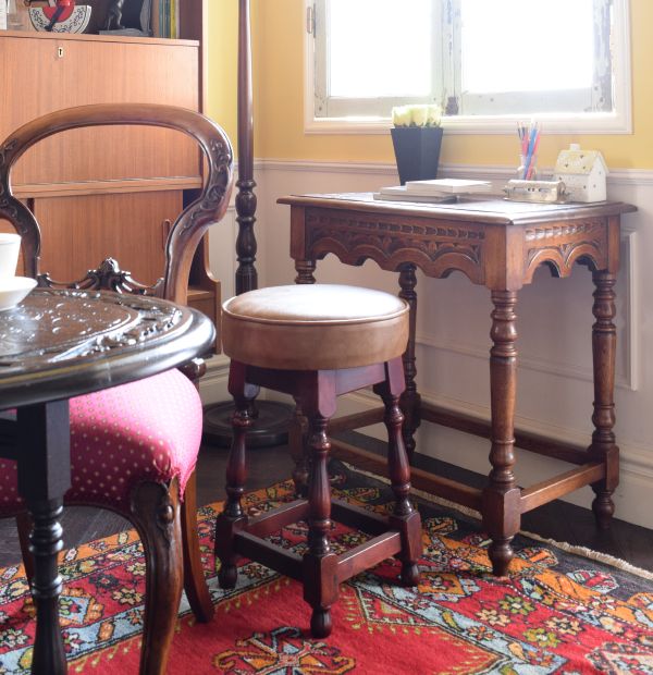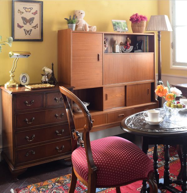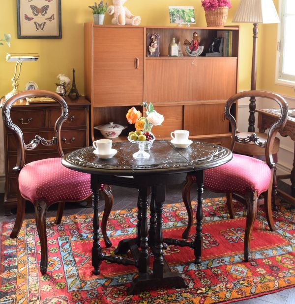 なんとなく懐かしい雰囲気が漂っているのが気になって連れて帰ってきたビンテージのサイドボード。ここにバルーンバックを組み合わせたら、どんな感じになるかな?時になって、コーディネートしてみました。 バルーンバックの透かし彫りがあまりにキレイだったので、ゲートレッグも浮き彫りが華やかなタイプをセレクト。 完璧な英国のデコラティブ空間が完成したけれど、個性を放つサイドボードのシンプルさに息が抜ける感じがする。好きだな~・・・