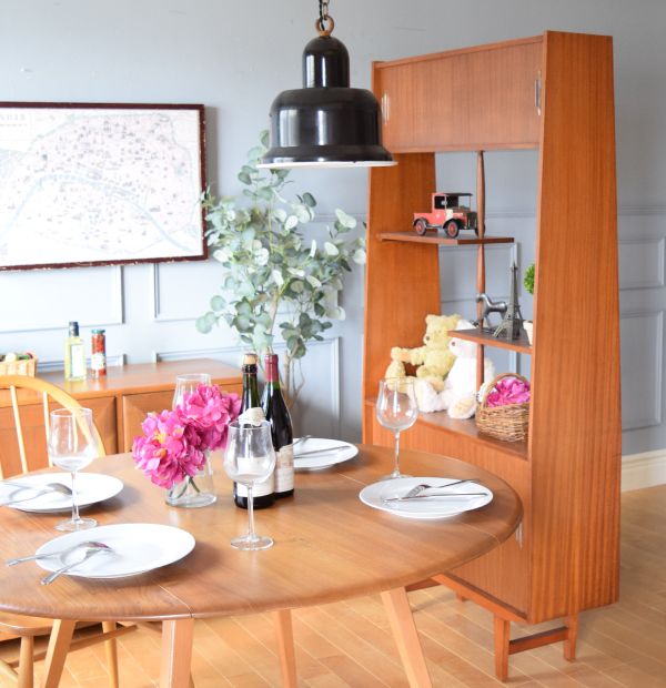 空を見ると梅雨空・・・雨の日を楽しみたいなと思って、スッキリしたデザインのビンテージ家具を集めたダイニングをコーディネートしました。 アーコールのテーブルとイスを組合わせた完璧なダイニングセットに、今日の主役のディバインダー登場! 壁面に置いてもいいんだけれど、間仕切りとして、に使って、ダイニングとリビングを仕切るのに使ってみました。ホウロウのペンダントライトを吊り下げて完成。この間仕切り家具。最高☆