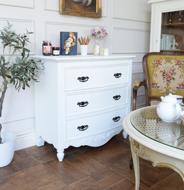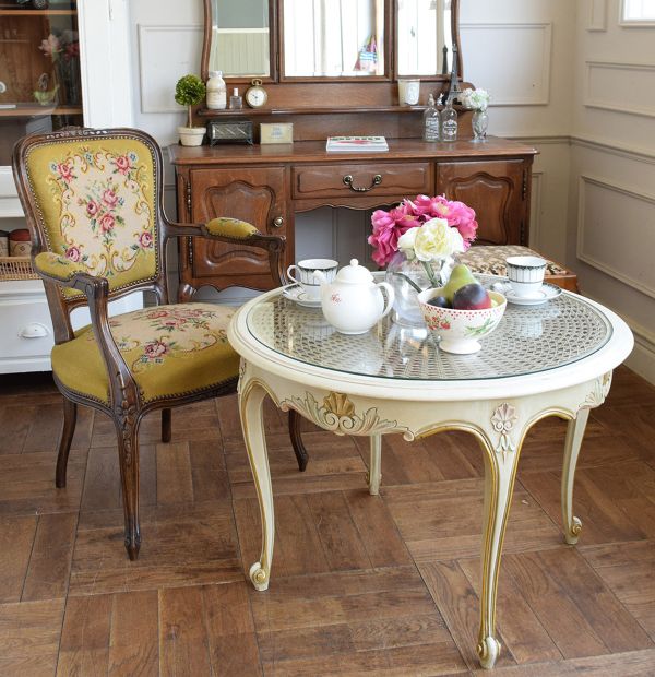 朝から暑い・・・けれど、テスト期間中でお弁当から解放されている私は、空いた時間でウォーキング。清々しい気持ちで紅茶を飲むお部屋をコーディネートしてみました。 今日も視覚から涼しくなろうと思って、ホワイトペイントの家具をメインにしたお部屋。壁も白いお部屋にしたので、全体がボケてしまうのが嫌で、ドレッサーとプチポワンチェアを濃い色のものを使って引き締めてみました。 気持ちよくスタート出来た日は、なんだかいいことありそうです。テスト、ガンバレ~!