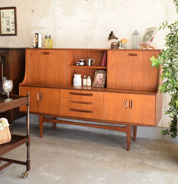 何気なく隣同士に並べた英国のキャビネットとビンテージのサイドボードの高さがピッタリ!なんだか良いコトがありそうだなと思いながら、ダイニングをコーディネートしました。 壁面のこげ茶色とカラメルソース色のコントラストが美しいな・・・と思って、同じように、ちょうど半分半分の色になるように家具を組み合わせてみました。 同じ茶色でコーディネートしないと思われがちですが、これくらい茶色のコントラストが違っていても逆に面白いから、気にせずに組み合わせてもらいたいな・・・と思っています。