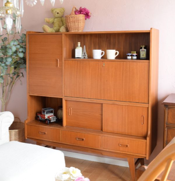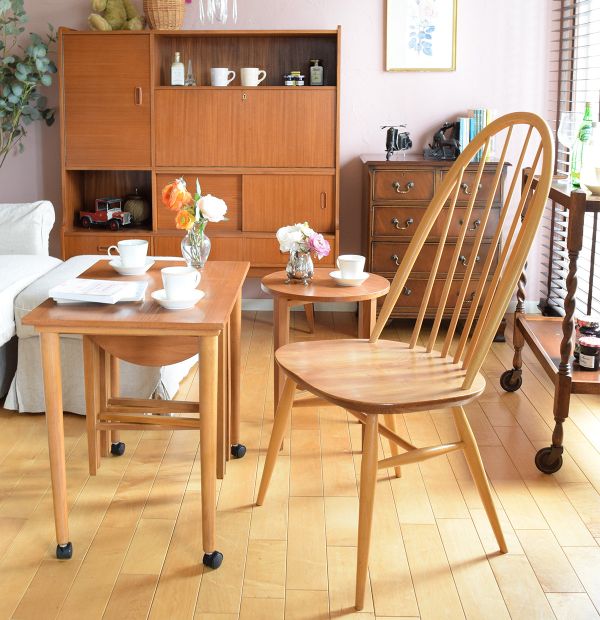 ネストテーブルの特集を作ってから、ネストテーブルの問い合わせがとても多いので、ちょっと特別なネストテーブルを使ったリビングをコーディネートしてみました。 たまに見つけることがある、5台タイプのネストテーブルなんですが、なんとなんと中に伸長式のテーブルが4台!使いきれないくらいギュッと詰まったテーブルをソファの周りのいろんな場所で使ってみました。 ちょっとめずらしい北欧スタイルのキャビネットと組み合わせたらなんだかおしゃれ。ビンテージ感が漂うリビングで、今日の晩ゴハンのメニューを考えています(笑)