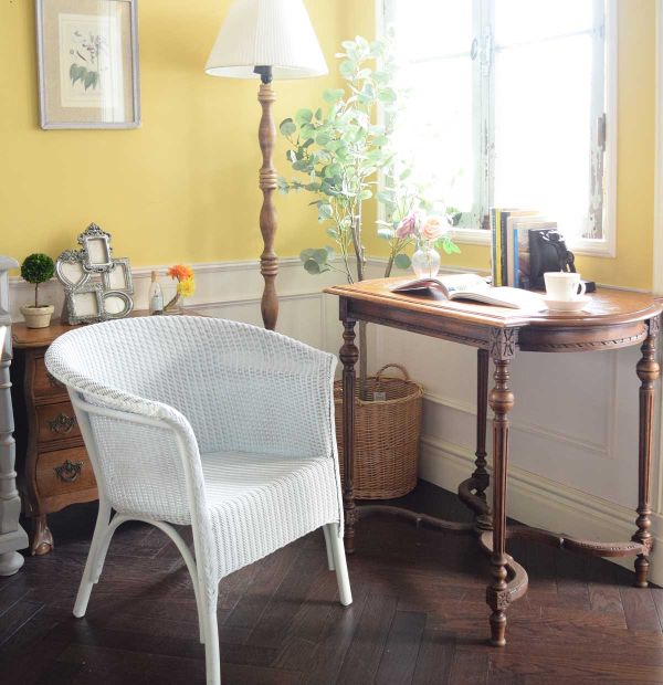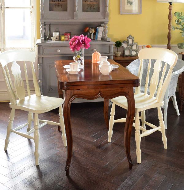 久しぶりにブルー色のペイント家具を設置して、大好きなフレンチカントリースタイルの部屋をコーディネートしてみました。 やっぱりペイントのアンティーク家具って、好きだな・・・と思いながら、一緒に組み合わせたのは、初めて見つけた小さなドローリーフテーブル。バイオリンの形のペイントの椅子とロイドルームをセットして完成! 美しいオケージョナルを窓際に置いて、大好きなフレンチスタイルのお部屋で過ごす時間を楽しんでいます。