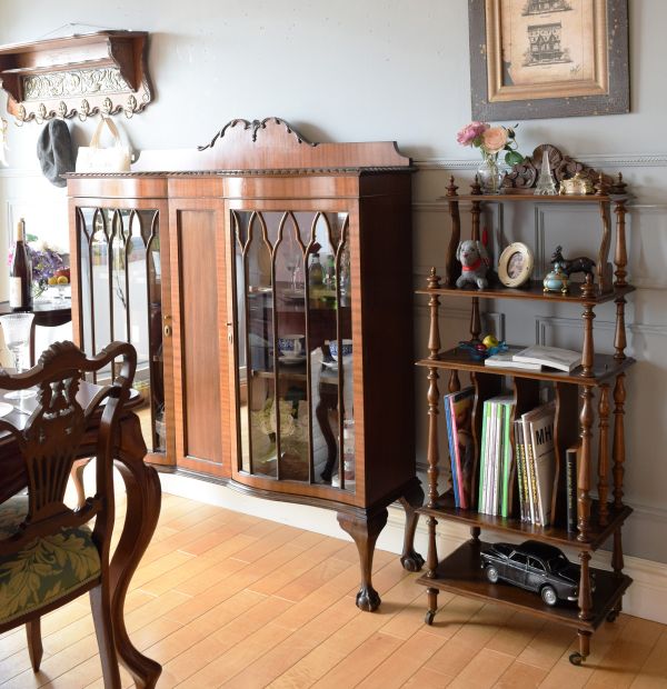この子の脚の曲線を、ぜひ横から見て欲しい!と思って真横から撮った今日のスタイリング。すごい曲線だと思いません?! 猫脚では勝てないので、背中の透かし彫りが美しい椅子と組み合わせて、カッコよくダイニングをコーディネートしてみたんですが、正面に大好きなポインテッドアーチのキャビネットをドーンと置いてカッコよく☆ 気付いたら、眺めているだけでお腹がいっぱいになるダイニングで、今日は何を食べようかな??