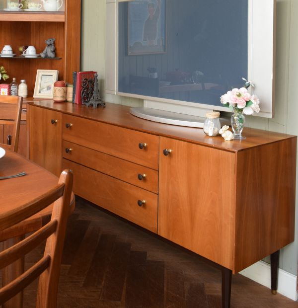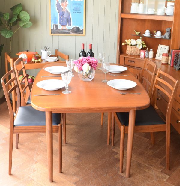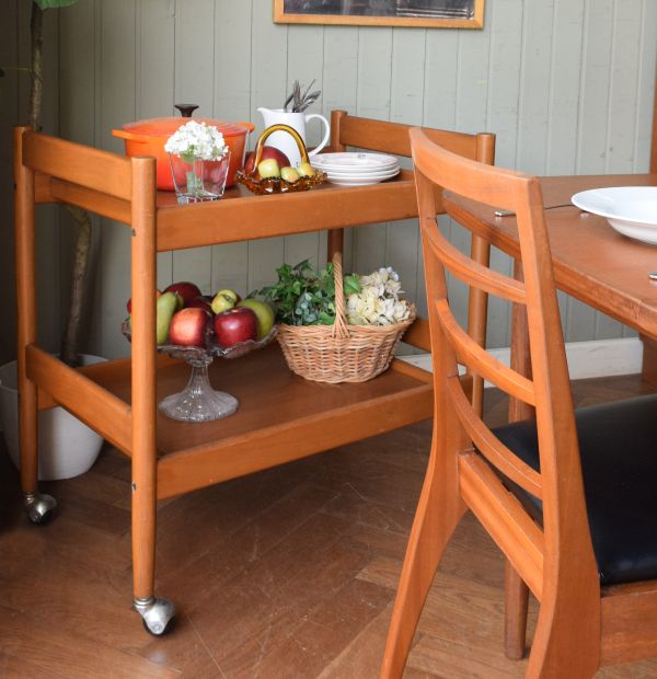 昨日の大雨が今朝まで続いて、どうなることかと思ったけれど、やっと過ぎ去って晴天。スッキリしたお天気の中、北欧スタイルのダイニングをコーディネートしてみました。 最近は、なかなか手に入らなくなった北欧スタイルのサイドボードの上にテレビを置いて、隣にG-PLANのダイニングテーブルセットを。高さがちょうどいいなと思いながら、目線に入る角にコーナーキャビネットを。 せっかくなので、おしゃれなワゴンを置いて完成。実用性と見た目の両方がバッチリのダイニングで、今日の夜ゴハンは・・・お好み焼き!(笑)