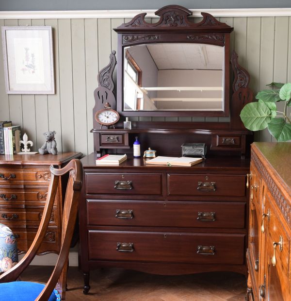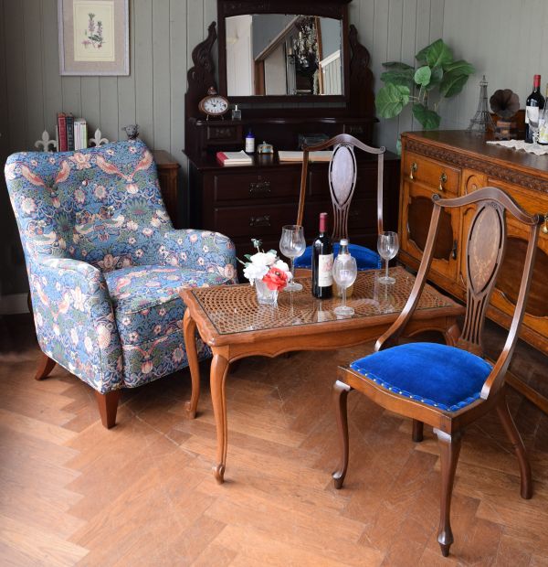 一瞬、パーラーキャビネットに見間違えてしまった大きなミラーのドレッサー(笑)となりにサイドボードを置いて、座面がブルーのパーソナルチェア3脚で、猫脚のローテーブルを囲んでみました。