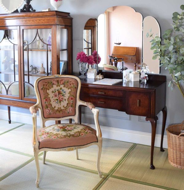 スイングを鏡でチェックするドレッサーのある和室