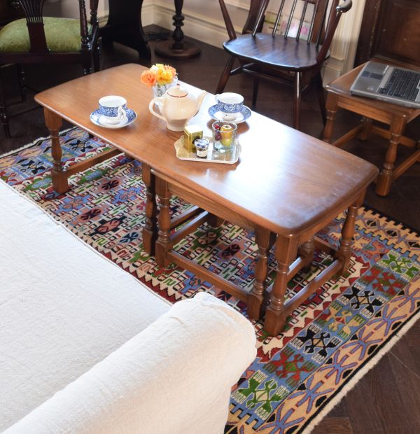 大阪から少年野球のチームが遠征の予定だったのに、大雨の影響でナシに・・・(涙)ぽっかり空いてしまった時間を過ごすリビングをコーディネートしてみました。 マリーの前に超めずらしいアーコールのネストテーブルを置いて、同じくアーコールのゴールドスミスチェアを。小さいネストテーブルにPCを置いて、甲子園観戦☆ 夏も終わりだな・・・と秋の気配を感じながらキリムをパッと敷いてみたら、秋色がプラスされて雰囲気よく仕上がりました。