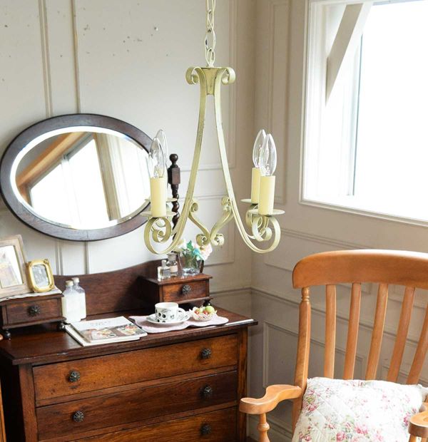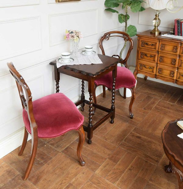 ちょっと濃い目の色で引き締めたくなって、チョコレート色のドレッサーとツイスト足のサイドテーブルにバルーンバックを組合わせてサロンを作ってみました。夜の風に揺られながら、シャンデリアの灯りで疲れをとりたいな・・・と思います。