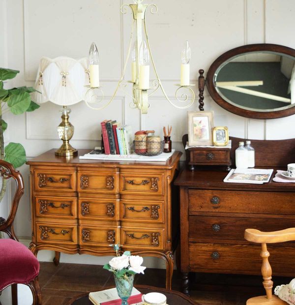背もたれが大きなロッキングチェアは、ちょっとカントリーな雰囲気になるので、今日の気分に合わせてエレガントなフレンチチェストをセレクト。