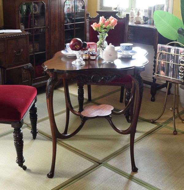 とってもめずらしい真鍮製のマガジンラックを脇に置いて、クラシックスタイルのキャビネットと書斎机を置けば完成。久しぶりに会う同級生と、いろんな話で盛り上がりそうです。