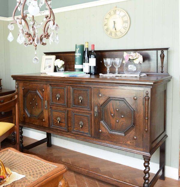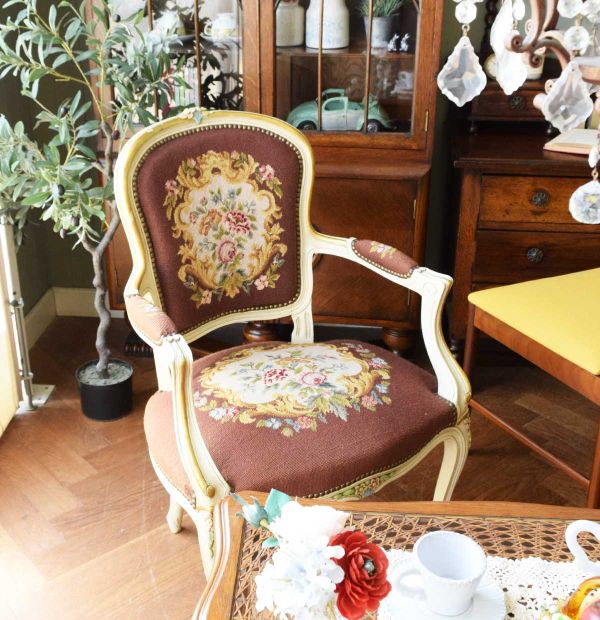 毎週、土曜日に通っているお花のお稽古が今日はお休みなので、久しぶりにゆったりとした土曜日の朝。お弁当を2人分作って送り出した後、まったりと過ごすリビングをコーディネートしてみました。 彫が美しいサイドボードと食器棚を並べて、英国アンティークらしい重厚な雰囲気を作ったところで、華やかさが欲しくなってプチポワンチェアをプラス。 大好きなオリジナルのシャンデリアを天井から吊るして、眺めているだけで気分が上がる~☆・・・とは言え、仕事はしないといけないので、気分を高めてガンバリマス。