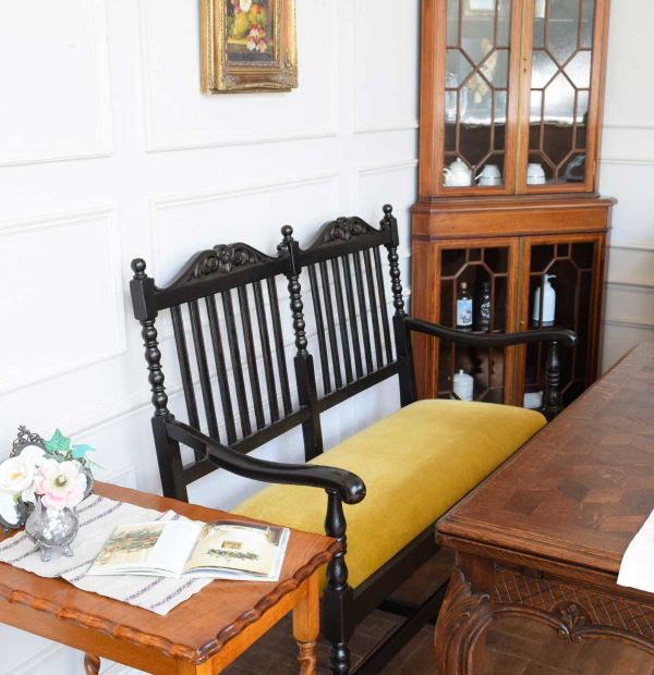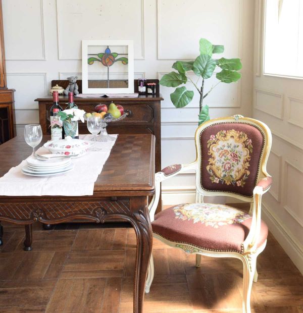 台風が来て以来、秋も深まってきたな・・・と思いながら、あたたかいお茶を飲むダイニングをコーディネートしてみました。 今日はちょっと小ぶりなサイズがめずらしいフレンチのドローリーフにプチポワンとベンチを組み合わせて、ゴハンを食べるというより、お茶するためのダイニング。 大好きなコーナーキャビネットを置いて、お部屋の角をピシッと引き締めて、お部屋をパッと華やかにするお花の模様のステンドグラスを設置。今日はマリアージュフレールのマルコポーロ気分、お花の香りを楽しもうと思います。