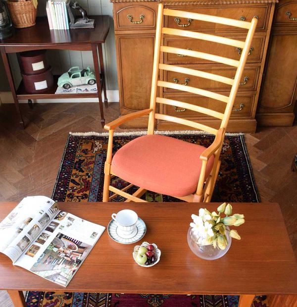 ちょっとめずらしい食器棚型のビューローが届いたので、お部屋のド真ん中にドーンと置いたところから始めたお部屋作り。 ビューローとして使おうかな?と思ったんだけれど、今日は飾り棚として使うことにして、ロッキングチェアを置いてゆったり過ごす部屋にしてみました。 ゆらゆら揺られるロッキングチェアの前にはシンプルなデザインのローテーブル。今日も美しいトライバルラグを敷いて、秋晴れのお日様の下で、本を読もうかな?