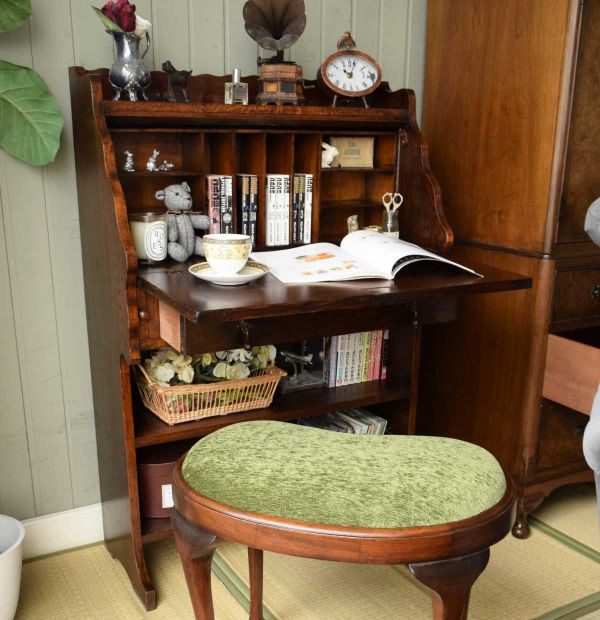 スイングを鏡でチェックするドレッサーのある和室