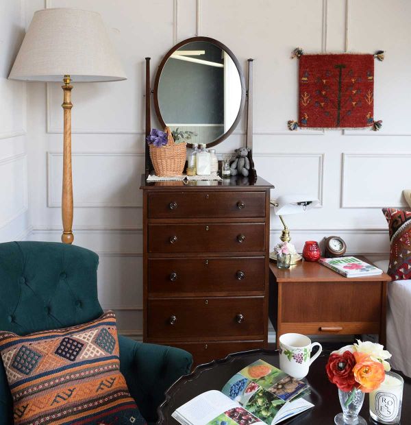ふっと今日は父の誕生日だったことを思い出して、父と思い出で会話する寝室をコーディネートしてみました。 立ったままお化粧できる便利なドレッシングチェストの横にフロアスタンドを置いて、最近、お気に入りの1人掛けのソファとティルトトップテーブルを。個性的なデザインのトライバルラグを敷いたら、まるでお花畑にいるみたいでテンションが上がる~(笑) この年になって、父の言っていたことがよく分かるな・・・と思いながらも、もうお喋り出来ないので、今日は実家にケーキを持ってお参りに行ってこようと思います。