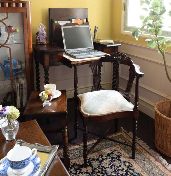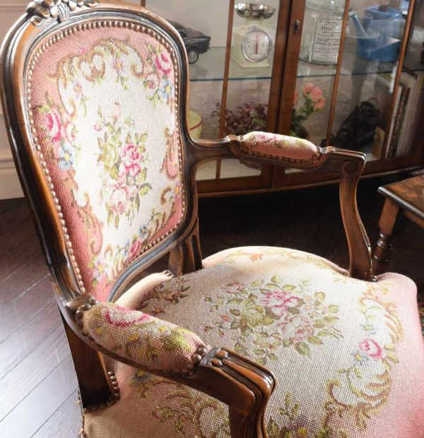 周りの家具の色を濃い目の茶色で組み合わせたことで、絨毯とプチポワンのお花がより華やかに見えるお部屋。お天気もいいす、いいお花の香りがぷ~んと漂ってきそうです。