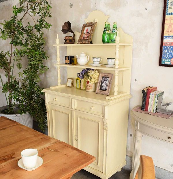 久しぶりにオールドパインの家具にチャーチチェアを組み合わせた私の大好きな空間。ここに白いペイントの家具を組み合わせて、オールドペルシャを敷いていつもと違う華やかさをプラス。
