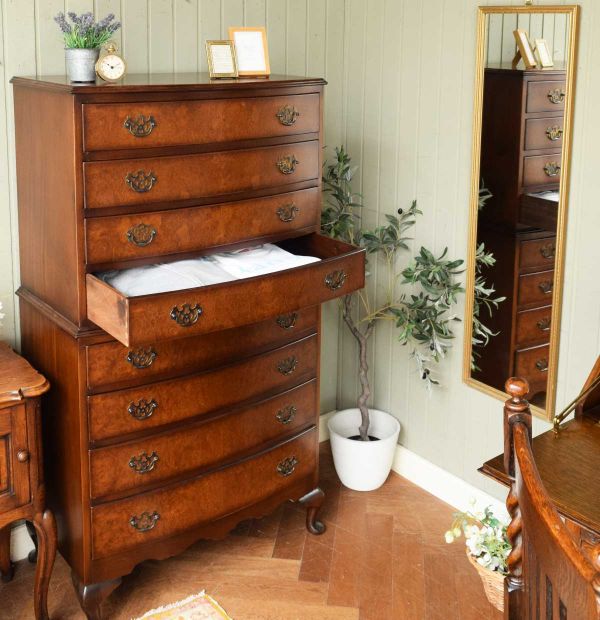 こんなホテルに泊まりたいな・・・と思いながら、大好きな家具ばかりを集めて寝室をコーディネートしてみました。 今日の主役は、たっぷりのお花の彫が入ったライティングビューロー☆ツイストのアームチェアを組合わせたら、それはそれはカッコよくて大満足! このカッコいい雰囲気に合わせたい!と思って選んだ落ち着いた色に輝く真鍮のアンティークシャンデリア。背が高い私向けのチェストオンチェストの脇に全身がチェックできる鏡を置いて、このまま泊まりたい気分デス(笑)