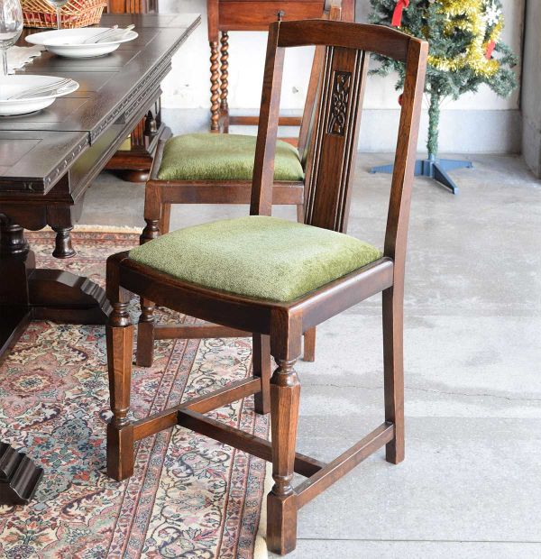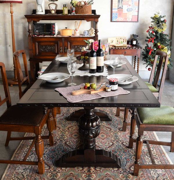 コーディネートしながら「あぁ・・・こんな部屋でゴハン食べたい~!」って思ってしまった英国アンティークなダイニング。いい感じに仕上がりました。 ドッシリした姿がカッコいいドローリーフテーブルを真ん中にドーンと置いて、めずらしく素直に同じようなバルボスレッグの椅子を組み合わせたら、やっぱりカッコいい! ダムウェイターを隣に置いただけで完璧なダイニングが完成。せっかくなのでトライバルラグを敷いたら最高☆ここにいるだけで貴族気分。貴族気分で・・・お鍋食べよう!