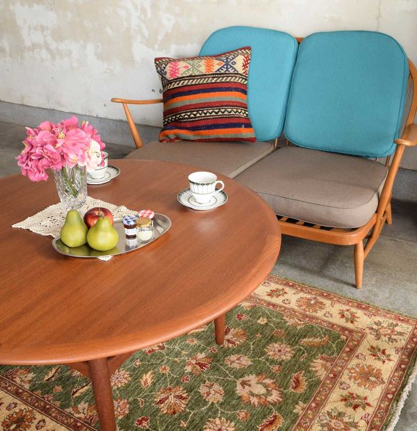 寒い~!昨日のポカポカ陽気がウソのように一気に真冬の気温になったので、薪ストーブを楽しむ部屋をコーディネートしてみました。 なんとなく北欧スタイルのリビングと英国スタイルのダイニングをコラボさせたくなって、アーコールのソファと丸いローテーブルを置いたリビングに、トライバルラグを敷いて間仕切りに。 ダイニングコーナーにはオーク材の彫が入った家具を使って、伝統的な英国スタイルのダイニングに仕上げました。ワンフロアを仕切るラグの使い方、ぜひ試して欲しいな~