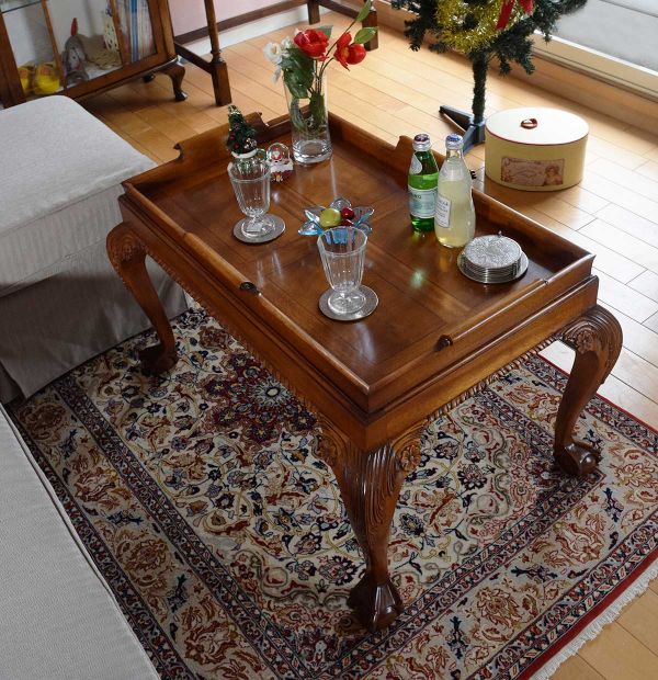 だんだんクリスマスが近づいてきたので、クリスマスツリーを出したリビングをコーディネートしてみました。 主役はクリスマスツリー☆なんだけれど、同じようにキラッと輝くアンティークガラスのシャンデリアを吊るして、ツリーとシャンデリアを眺めるためにソファを置いてみました(笑) 足元が寒いので、美しいトライバルラグを敷いて、下にホットカーペットを。ガッチリと球を掴んでいるクロウ&ボール脚のローテーブルを真ん中に置いたリビングで、リラックスしてから仕事に戻ります。