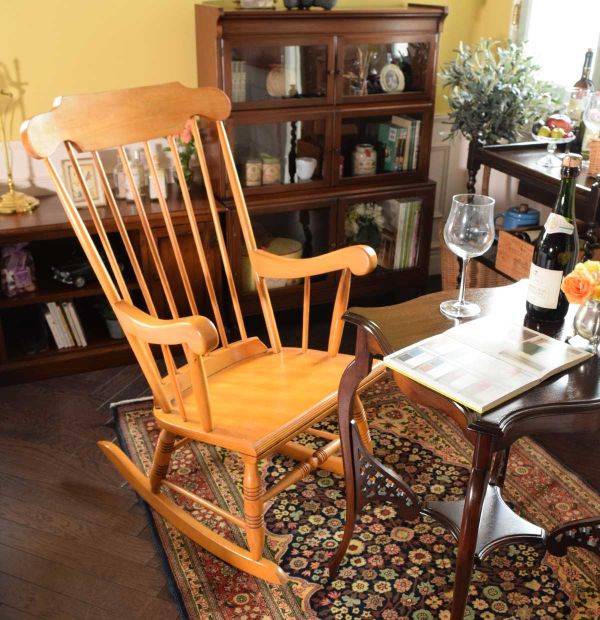 引き続き、今日も朝から寒い・・・(涙)こういう時は、薪ストーブしかない!と、薪ストーブを眺めながら過ごす寝室をコーディネートしました。 やっぱり薪ストーブと過ごすときの必須アイテムは・・・ロッキングチェア☆背中まで包み込んでくれるロッキングチェアと足のデザインが美しいオケージョナルテーブルを組合わせるだけで、最高の時間が過ごせる寝室が出来上がりました。 私の中で完璧なのは、壁面に置いた2台のキャビネット。一番下の棚の高さが絶妙に同じなので、お揃いのようにスッキリ並んでいい感じデス。
