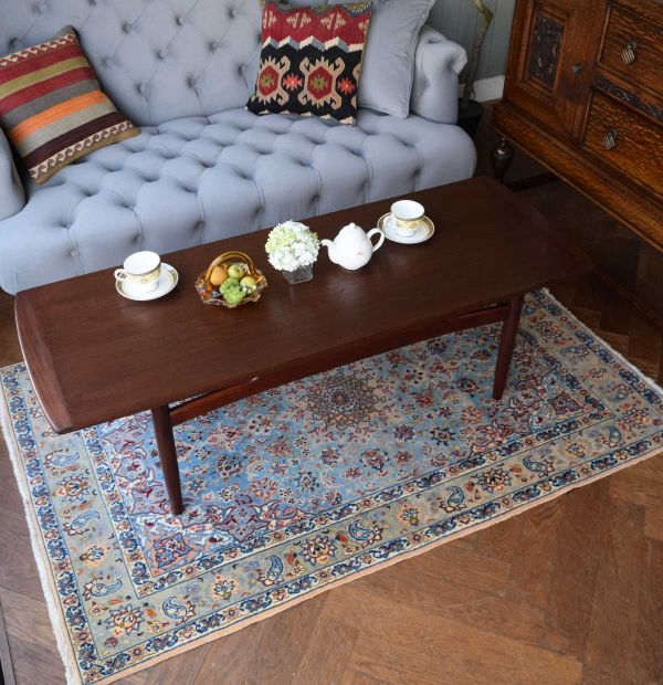 新作のボタンダウンのソファが到着したので、おしゃれな部屋が作りたい!と思ってコーディネートした今日のスタイリング。 グレー色のソファは、どんなお部屋にも似合うので、英国アンティークらしいサイドボードとシンプルなデザインのセンターテーブルを組み合わせて、彩りにオールドキリムのクッションをプラスしてみました。 最近は、床にラグを敷かないと、なんだか中途半端な気分になっちゃうようになってしまった私。最高におしゃれなペルシャをセレクトして気分もいい~!