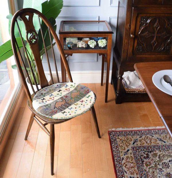 この時期、板座の椅子の必須アイテム、ギャッベを座布団代わりに使ったアーコールチェアのあるダイニングをコーディネートしてみました。 壁面にはカップボードとして、彫がたっぷり入った板扉のキャビネットを中心に、シンメトリーにジュエリーケースとチェストを置いてみたら、高さがちょうどよくていい感じ~! いろんな色のギャッベを座布団として使うだけで、いつものアーコールがちょっと違う雰囲気に見えるから面白い~!実は、わが家のダイニングでもこんな風に使っています☆
