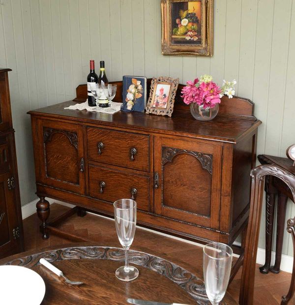 大きなワードローブを食器棚に使う、英国スタイルのダイニング