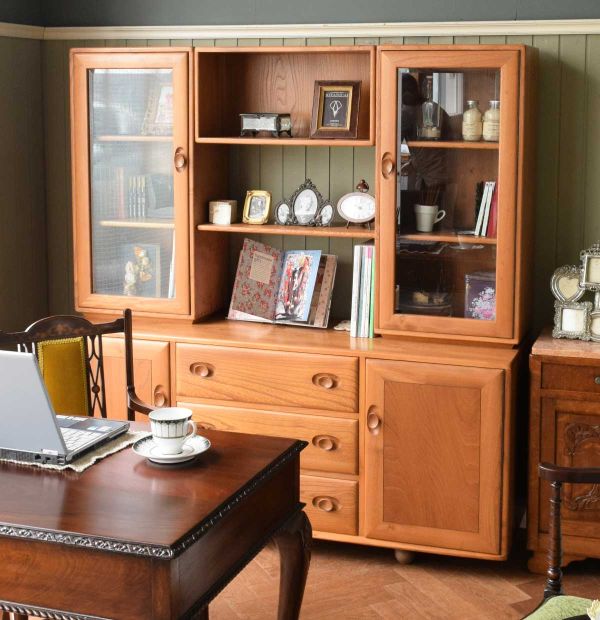 大きな本棚のある書斎を作りたくなって、目に留まったのがアーコールのキャビネット。これを本棚にするとカッコいいな・・・と思って、プレジデントデスクの奥に置いてコーディネートしてみました。