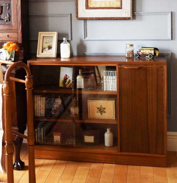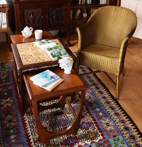 壁面には背が高いキャビネットを中心に、両サイドに小ぶりなものを置いて凸凹スタイルに。ネストテーブルも同じように凸凹に配置して統一感?を出してみたら、なんだか面白くて気に入っています。
