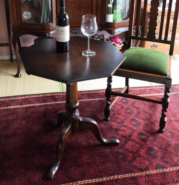 ちょうど届いたばかりのパーラーキャビネットを真ん中にドーンと置いて、信長だったらこれを選ぶだろうって思う、運気が上がる八角形の天板のティルトトップテーブルを。