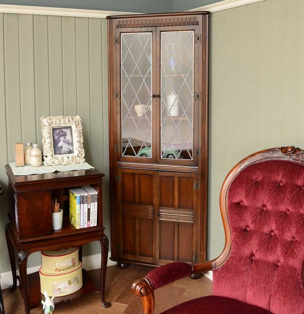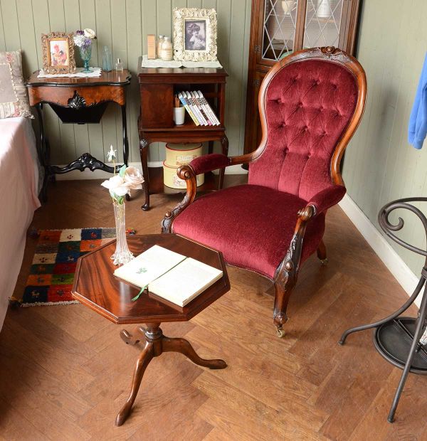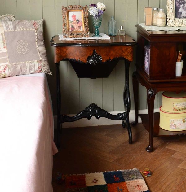 ベッドの脇には、とってもめずらしいソーイングボックスをサイドテーブルとして設置。大きな背もたれのナーシングチェアに包み込まれながら夢見る寝室には、コーナーキャビネットを置いてスッキリとまとめてみました。