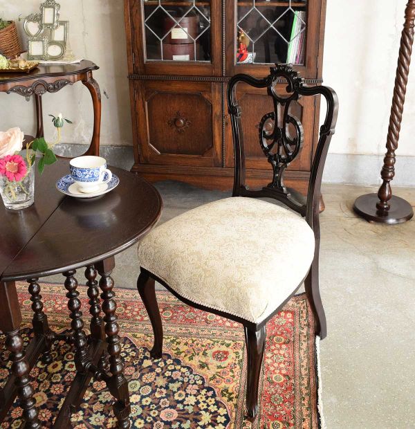夕方から主人と一緒に恩人に会いに行くので、朝からドキドキワクワクしています。何年ぶりだろう?どんなお話が聞けるだろう??と思いながら、英国アンティークなお部屋をコーディネートしてみました。 まるで芸能人の対談番組のように、サロンチェアを2脚並べたトークスペース。壁際には大きなガラスキャビネットとコンソールを置いて、最後にフロアスタンドを足しました。 落ち着いたトーンで華がない時におススメなのがやっぱりトライバルラグ☆これ一枚で一気に華やかな空間になったので、さらにワクワクしながら、そろそろ出かけます。
