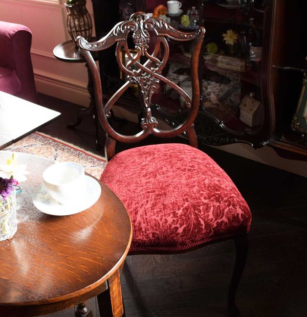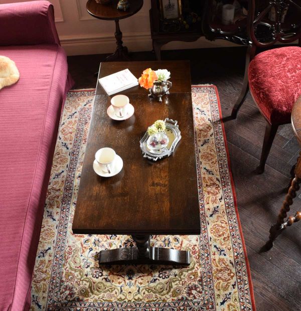 せっかくなので、超豪華バージョンでパーラーキャビネットを置いて、父が好きだったオーク材のテーブルを、2人でお茶を楽しむサロンチェアで囲んだお部屋。