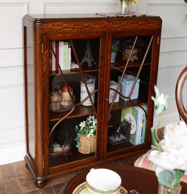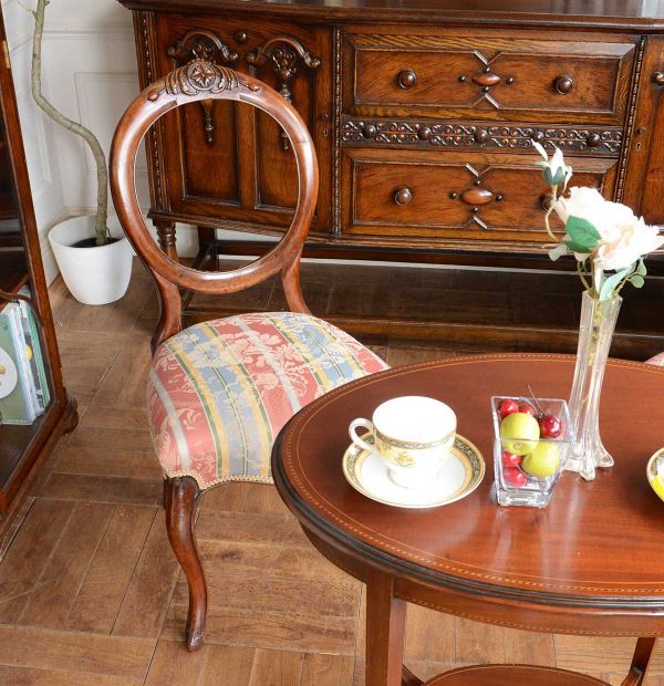 バルーンバックと組み合わせたのは、象嵌が美しいオケージョナルテーブル。この組み合わせだけでアンティーク家具らしさがプ~ンと漂ってくるので、周りに置く家具はどんなものでも、絶対に似合う自信があります☆