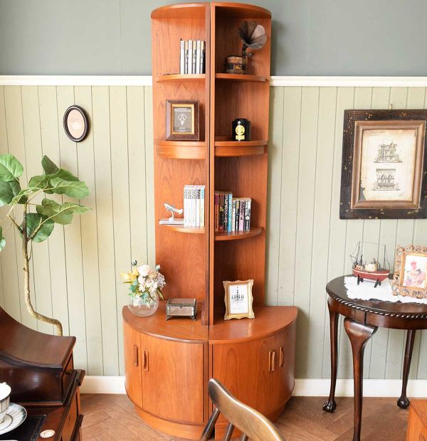なかなか手に入らなくなったビンテージ家具の代表、G-PLANの壁面収納。たくさん買い付けてきたと思っていたのに残りが少なくなってしまったので、撮れるうちに組み合わせたい!と斬新な書斎をコーディネートしてみました。 先月のコーディネートでご紹介した壁面収納の並び方を変更。コーナーを2つ組み合わせてハーフムーン型の本棚にしてみたら、これはこれでなかなか面白い~(笑) 真ん中にプレジデントデスクをカッコよく置いて、図書館の受付のような雰囲気。もっとG-PLANを組み合わせて楽しんでみたいな・・・