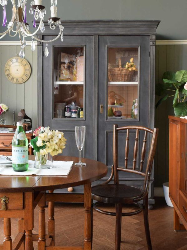 最近、ゲートレッグテーブルを使うことにハマっている私(笑)今日は大きく広げてダイニングテーブルとしてベントウッドチェアを組合わせてみました。 いろんなスタイルの家具を組み合わせたくて、北欧スタイルのリビングボードとフレンチペイントの大きなガラスキャビネット、フレンチチェストを組み合わせたハンドルスタイル☆ キラキラっと輝く大きなシャンデリアを吊るして完成!いろんなスタイルの家具が並んで、いい感じにまとまりました。