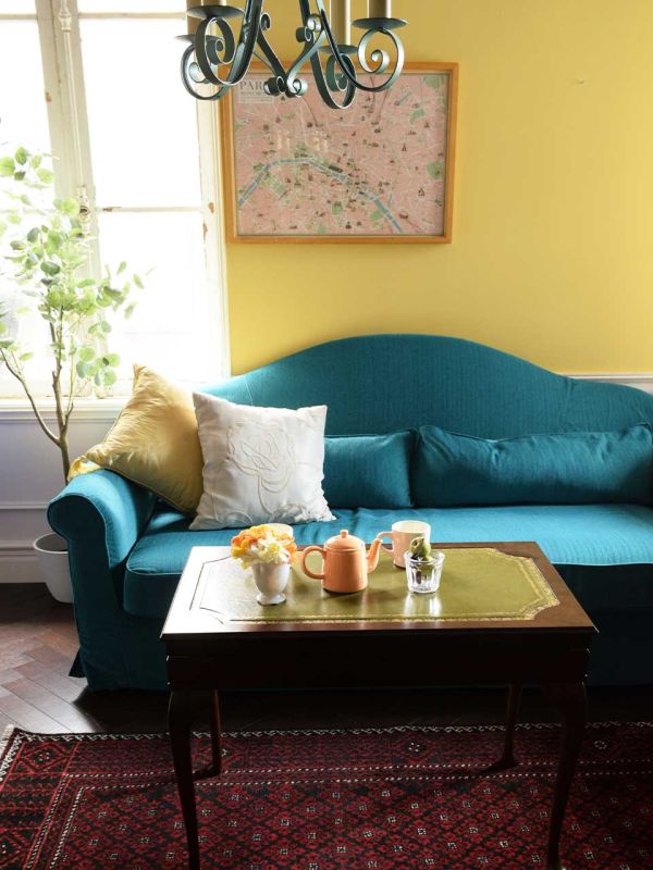 ちょっと小ぶりなアーコールのダイニングテーブルをソファの横に置いて、サイドテーブルとして使った北欧スタイルのリビングをコーディネートしてみました。 イメージは8マンションの8畳のリビング。コンパクトだけれど、ちゃんど座ってゆったり出来る3人掛けのソファを置いて、ビンテージのテレビボードとチェスト、そしてサイドテーブルをしっかり置いて過ごしやすく作ってみました。 ソファの色に合わせてシャンデリアもブルーで。太陽のようなイエローの壁に爽やかな空色を組み合わせて、夏に向かうリビングが完成です。