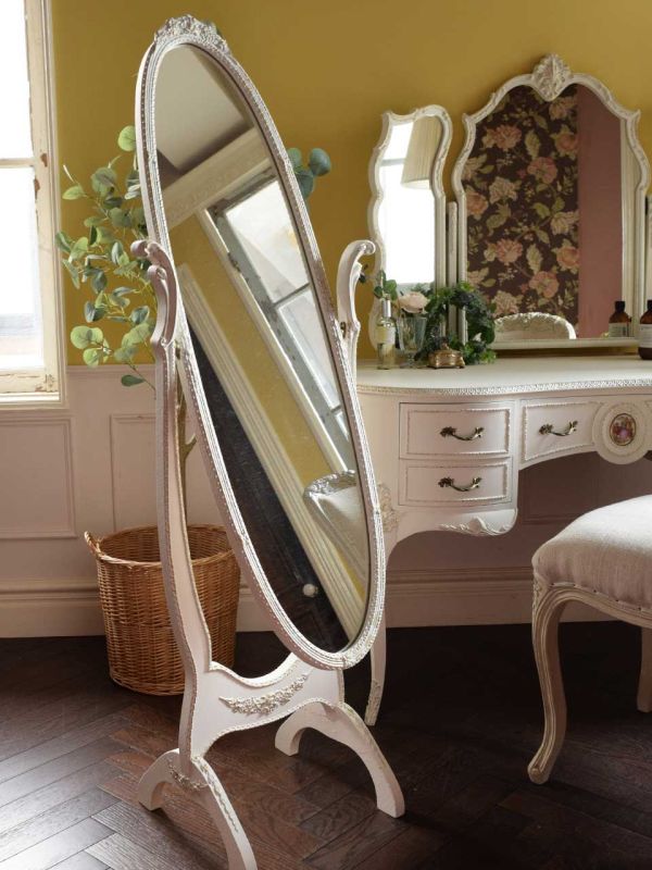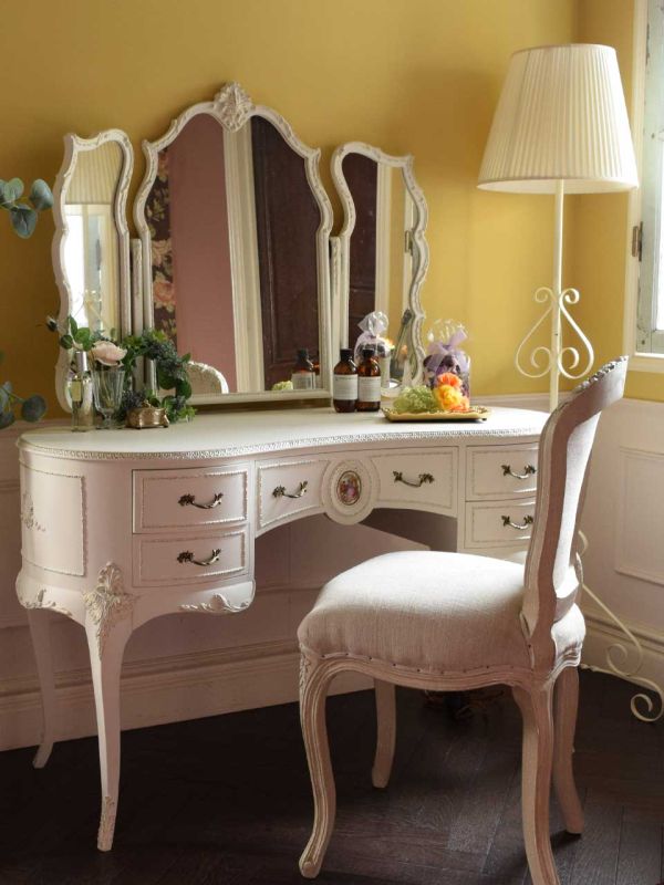 ぎっくり腰生活4日目。やっと昨日より少し調子がよくなってきたことを感じるのは、朝、目覚めて体を起こすときだな・・・と思いながら、女子力高めの寝室をコーディネートしてみました。 真っ白なフレンチドレッサーにベッドサイドチェスト、そしてフォルムもキレイなシュバルミラーを置いた寝室にいるだけで、テンションがあがる~(笑) フランスから届いた椅子と組み合わせて、ドレッサーの前に座って、鏡を見ながら今日も一日、腰にベルトを巻いてガンバリマス☆