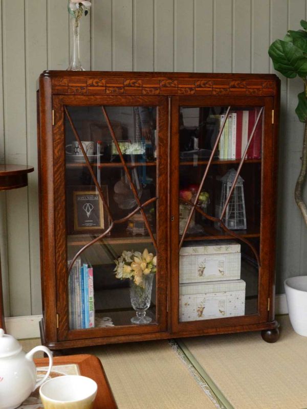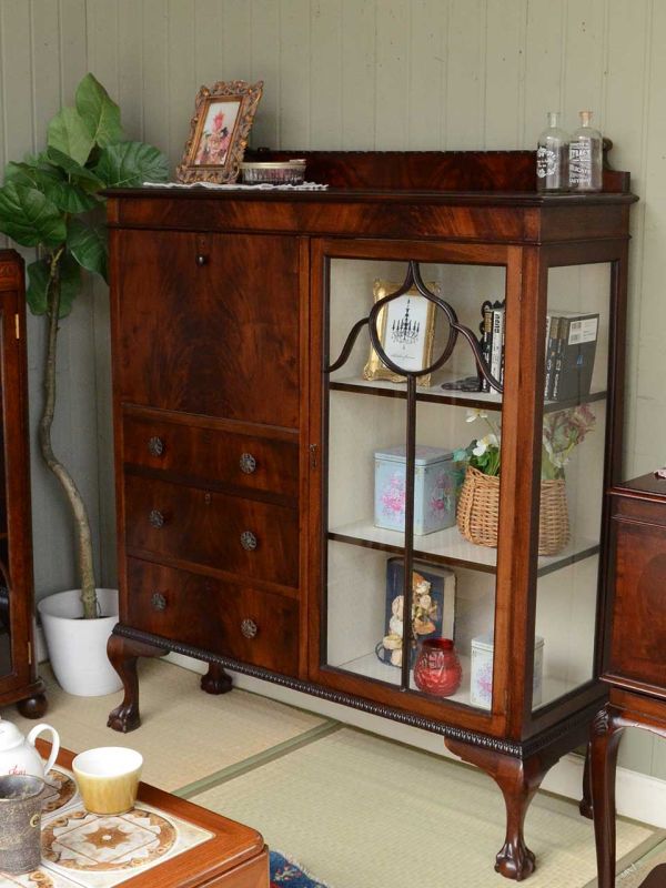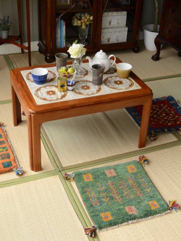 今日の夜は、末っ子が野球教室の見学に行くので、私と主人と義母の3人。帰りを待ちながらお茶する和室をコーディネートしてみました。 畳とオーク材のアンティーク家具はよく似合う~!と思いながら、彫が深いキャビネットを置いて、ちょっと重くなりすぎないように猫足のキャビネットとリボルビングブックケースを。 ちゃぶ台代わりにタイルトップのG-PLANを置いたら、めっちゃいい感じ~!小さなギャッベを座布団の代わりに置いて正座しながら、末っ子の帰りを待ちます(笑)