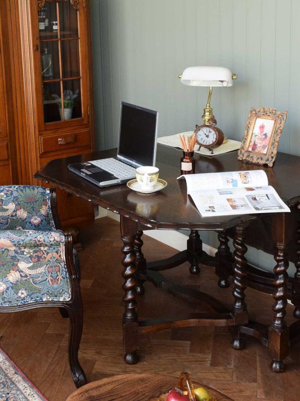 ゲートレッグテーブルに並んで2人で仕事をこなす英国スタイルの書斎