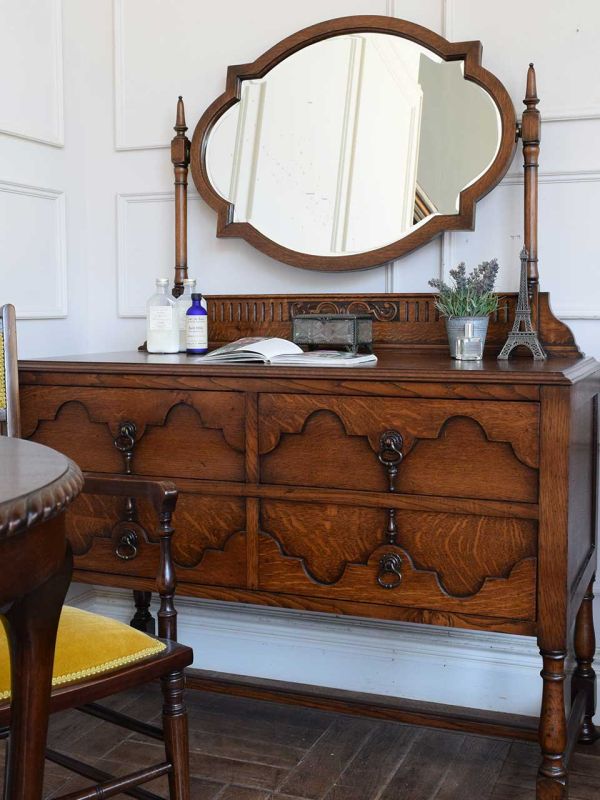 めずらしい形のミラーが付いたドレッサーのある寝室