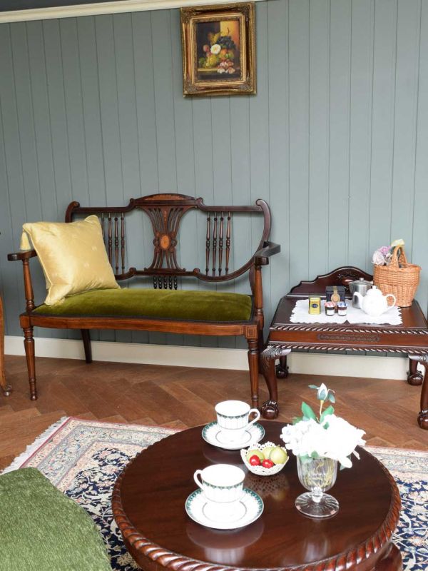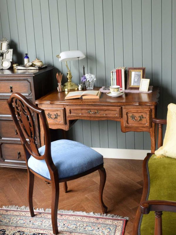 同じようなグリーンの生地で張り替えたセティとナーシングチェアを組合わせて、今日は書斎をコーディネートしてみました。 2脚の間に、クロウ&ボールの丸いローテーブルを置いて、セティの横にはまるでお揃いのようなサイドテーブルを。同じようなスタイルではなく、あえてフレンチスタイルのデスクを組合わせることで、華のある書斎を作ってみました。 さらにお部屋を華やかにしてくれるのはオールドペルシャ☆サッと敷くだけであっという間に華やかな雰囲気を作ってくれる絨毯のスゴサを改めて感じています。